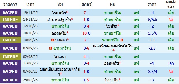 ผลงาน 10 นัดหลังสุดของทีม ซานมารีโน่