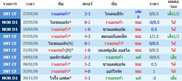 ผลงาน 10 นัดหลังสุดของทีม วาเลเรนก้า