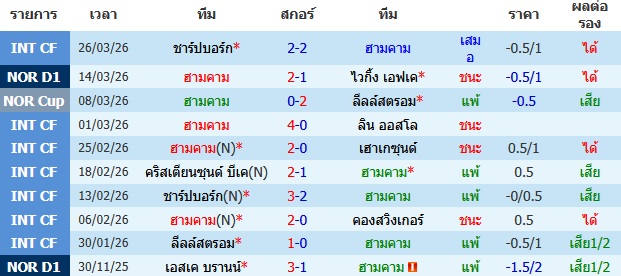 ผลงาน 10 นัดหลังสุดของทีม ฮามคาม