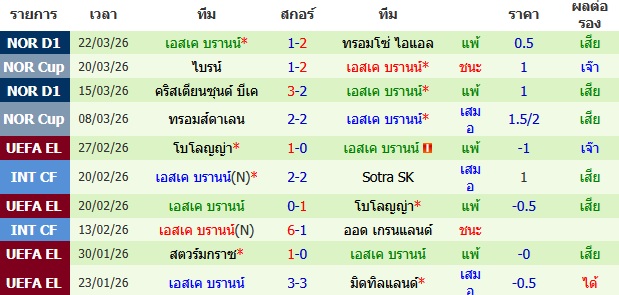 ผลงาน 10 นัดหลังสุดของทีม เอสเค บรานน์
