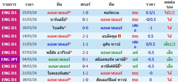 ผลงาน 10 นัดหลังสุดของทีม ดอนคาสเตอร์