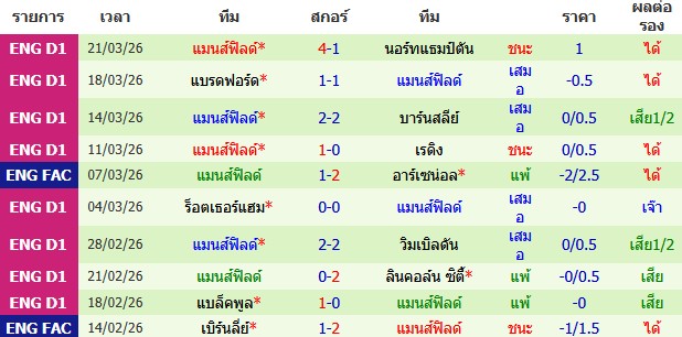ผลงาน 10 นัดหลังสุดของทีม แมนส์ฟิลด์