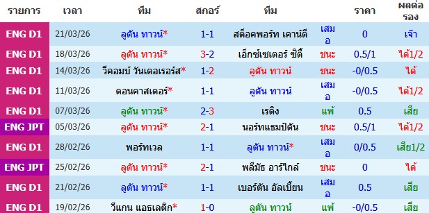 ผลงาน 10 นัดหลังสุดของทีม ลูตัน ทาวน์