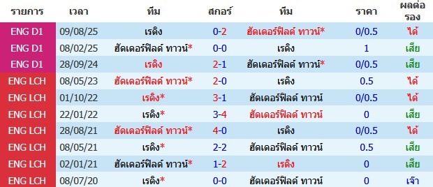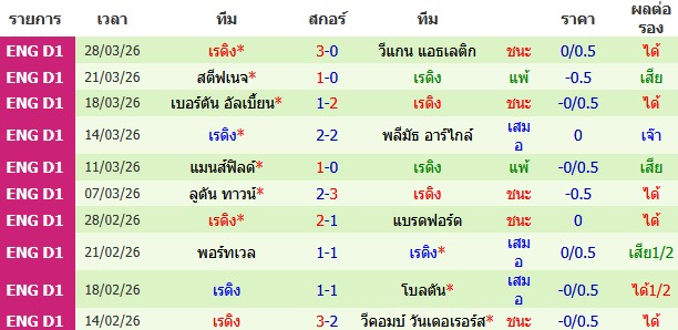 ผลงาน 10 นัดหลังสุดของทีม เรดดิ้ง