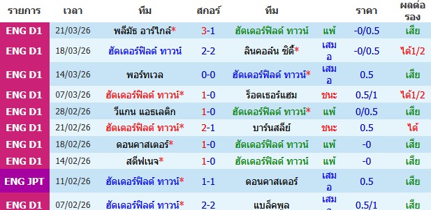 ผลงาน 10 นัดหลังสุดของทีม ฮัดเดอร์ฟิลด์ ทาวน์