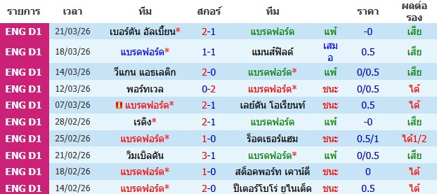 ผลงาน 10 นัดหลังสุดของทีม แบรดฟอร์ด
