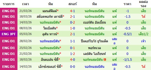 ผลงาน 10 นัดหลังสุดของทีม นอร์ทแธมป์ตัน