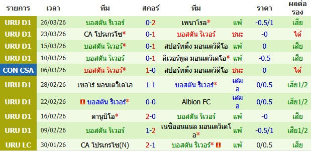 ผลงาน 10 นัดหลังสุดของทีม บอสตัน ริเวอร์