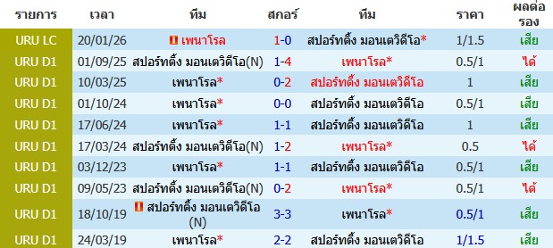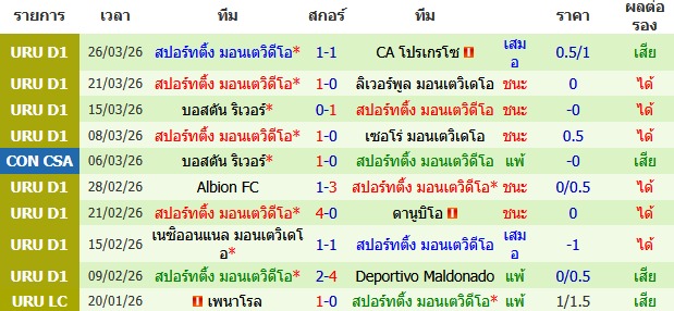 ผลงาน 10 นัดหลังสุดของทีม สปอร์ติ้ง มอนเตวิดีโอ