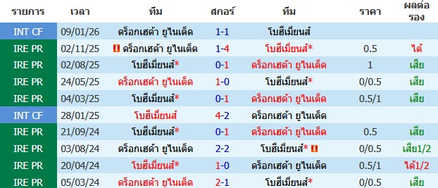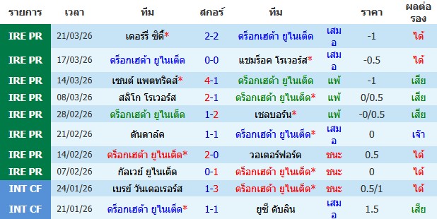 ผลงาน 10 นัดหลังสุดของทีม ดร็อกเฮด้า ยูไนเต็ด