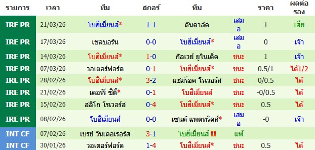 ผลงาน 10 นัดหลังสุดของทีม โบฮีเมี่ยนส์