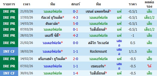 ผลงาน 10 นัดหลังสุดของทีม วอเตอร์ฟอร์ด