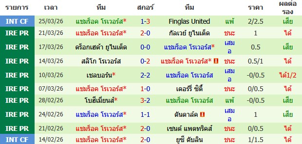 ผลงาน 10 นัดหลังสุดของทีม แชมร็อค โรเวอร์ส