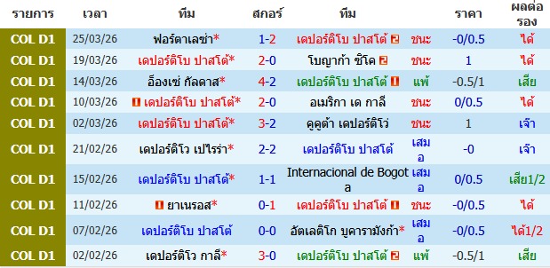 ผลงาน 10 นัดหลังสุดของทีม เดปอร์ติโบ ปาสโต้
